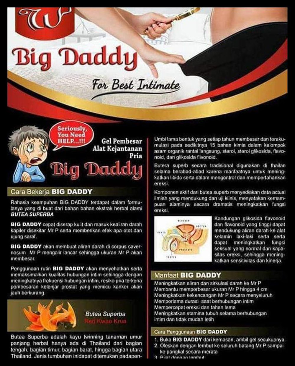 Berikut bahan komposisi yang ada dalam Woo Tekh Big Daddy-Hygiene Intimate Gel, dimana bahan utama produk ini adalah Butea Superba.